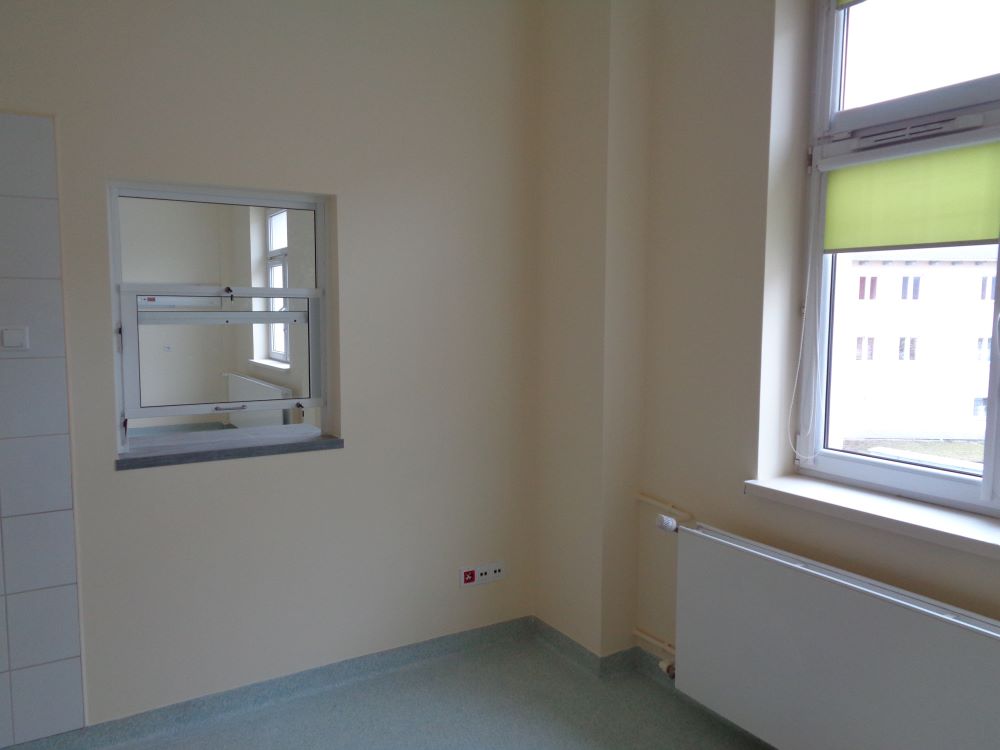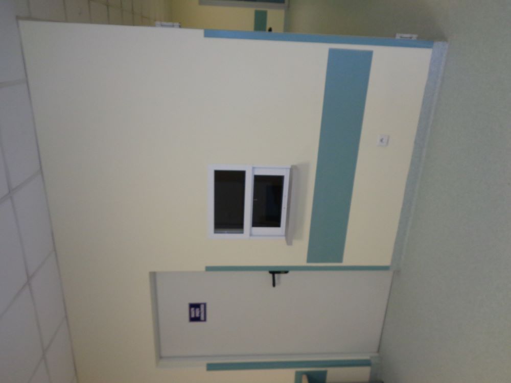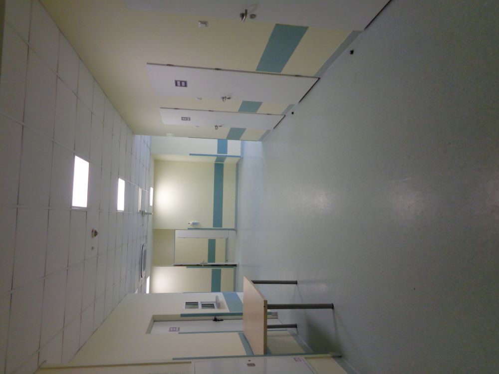 Korytarz Oddziału, białe ściany, niebieskie listwy odbojowe i niebieska wykładzina na podłodze